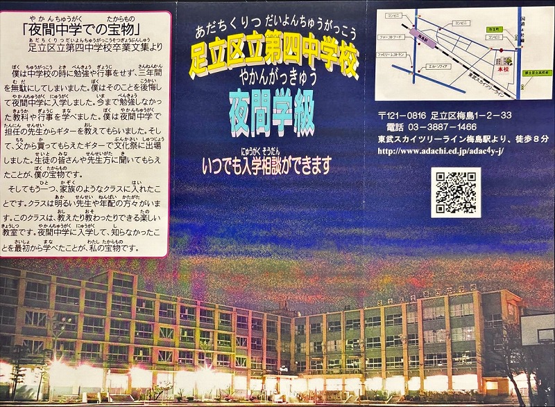 夜間中学の目的は、ご存じのように戦後間もない混乱期に生活困窮などから義務教育を受けられなかった人々や、不登校などの理由で中学校に通えなかった人を対象に運営されてきましたが、日本で就労する外国人が増加するにつれて、現在では在留外国籍の人々に対しても、中学校教育の機会を提供し、日本語教育を含めた「学び直し」を支援することが多くなってきています。もちろん日本人もいます。年齢は16歳から73歳まで様々な年齢がいます。半分ぐらいが働いているようでした。16歳以上であれば、一度中学を卒業した人も入れます。入学試験はなくて、入りたい人が来れば随時入学できます。学費は無料です。入学試験もありません。