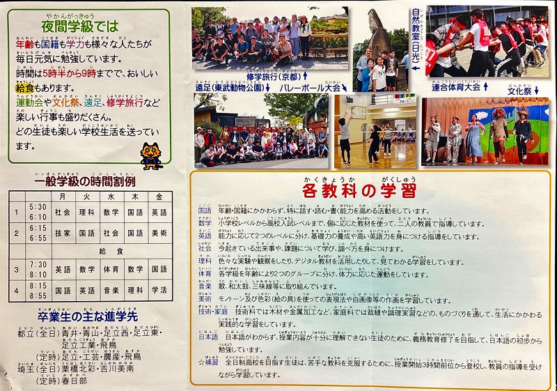 入学したあとは、日本語のアセスメントテストを受けてもらって習熟度別にクラス分けをするのだそうです。夜間ですから、働きながら学べる学校です。令和2年では、全国で17校、東京には8校あります。全区にあるわけではありません。