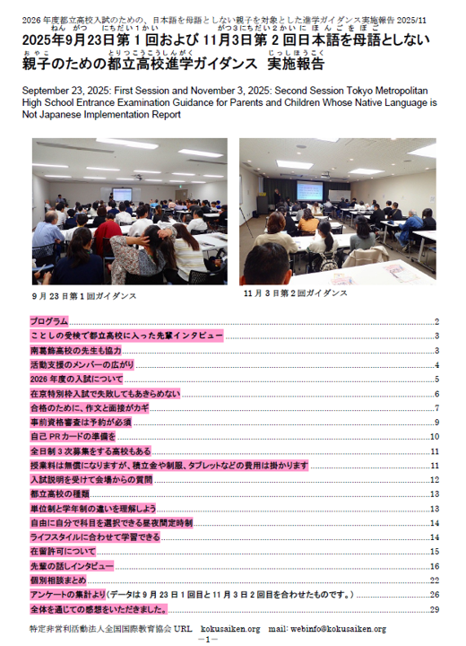 9月23日第1回、11月3日第二回日本語を母語としない親子のための都立高校進学ガイダンス報告